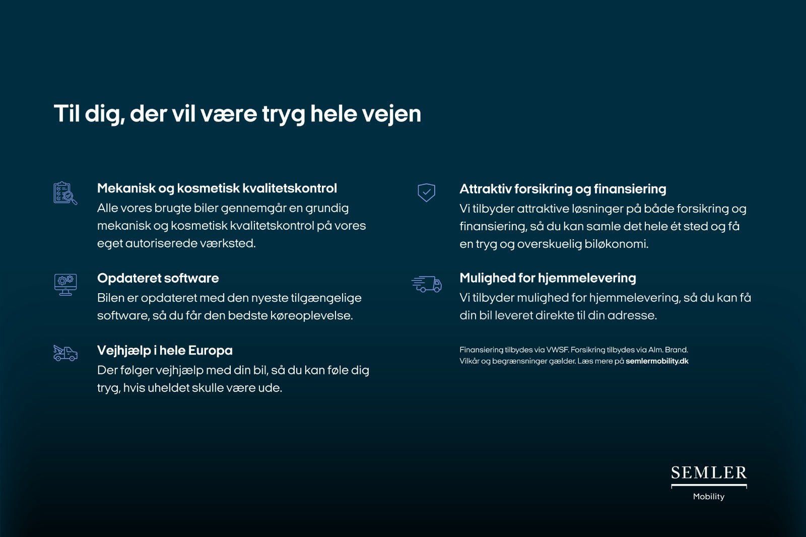 * Forudsætter køb af Clever One m./u. standardinstallation af ladeboks hos Semler Mobility Retail A/S. Fortrydelsesret på Clever One abonnement gælder. Mindstepris i bindingsperiode (6 mdr.): 0 kr. Tilbagebetaling: Udregnes som dit kWh-forbrug x gns. strømpris pr. kWh i DK mellem kl. 24-06 i md. og udvides i april-sept. m. kl. 11-17. Læs mere: clever.dk/tilbagebetaling. Gælder kun ved køb af en brugt elbil fra Audi hos Semler Mobility Retail A/S i perioden 28.3.26 - 30.4.26.